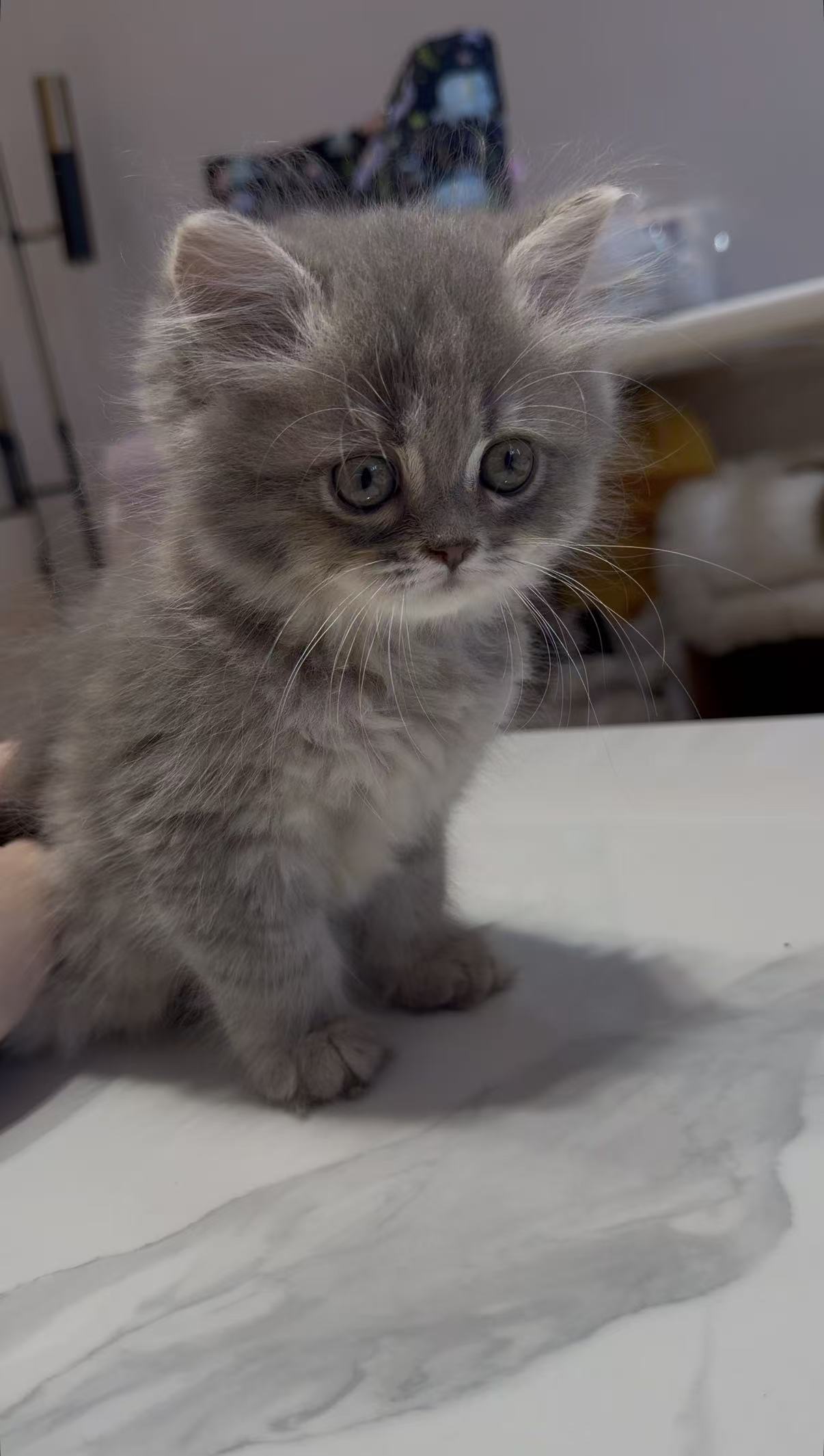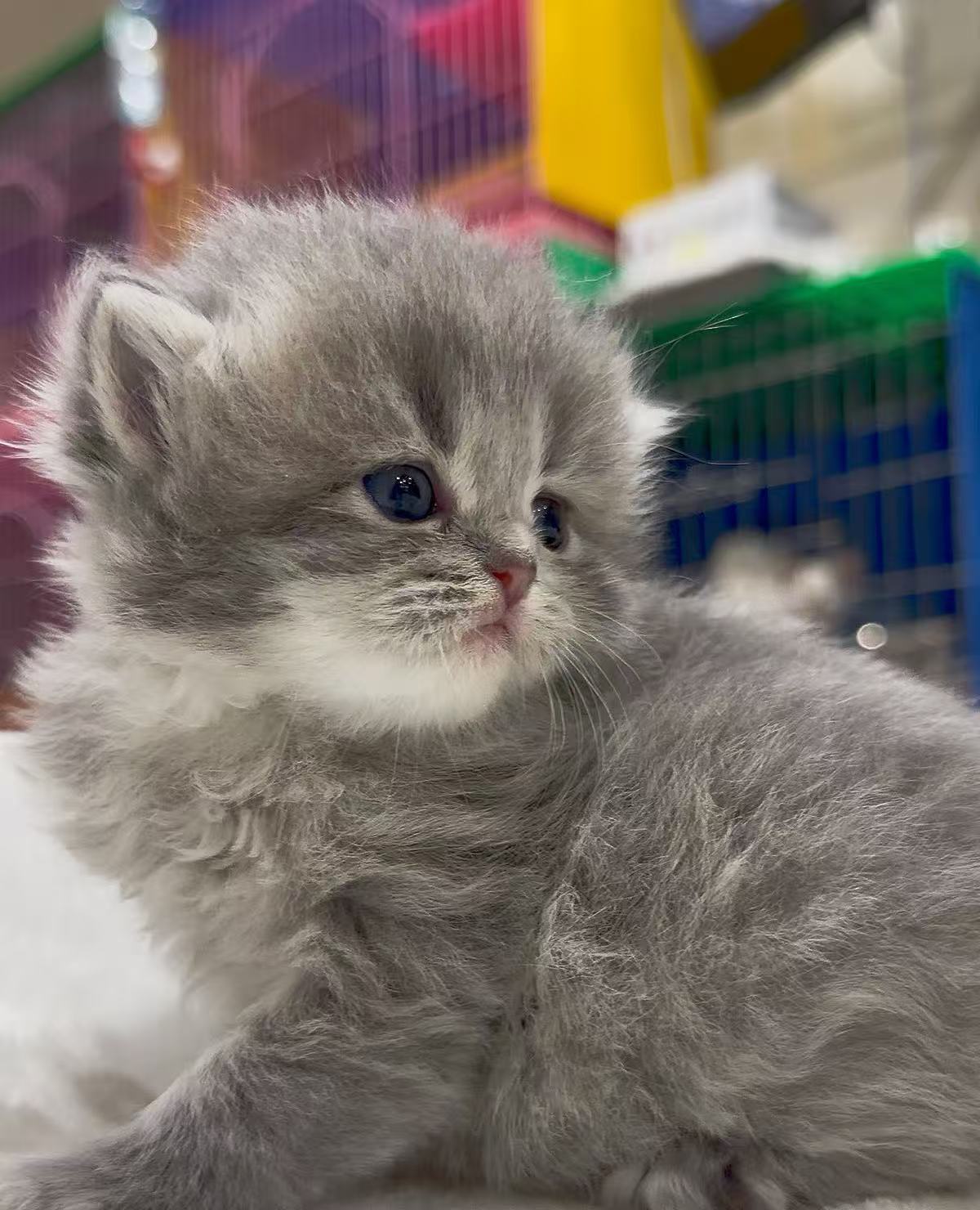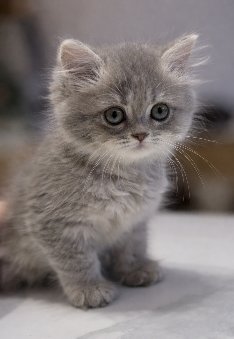 淺藍漸層英短以清透柔霧的淺藍灰為底色,毛尖伴隨著銀色白釉,整體色調寧靜高雅又不失溫柔感。